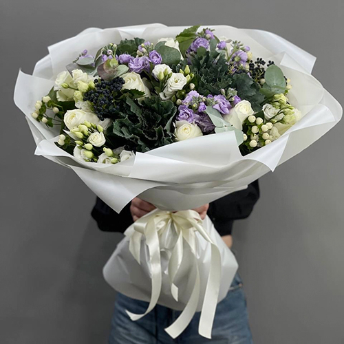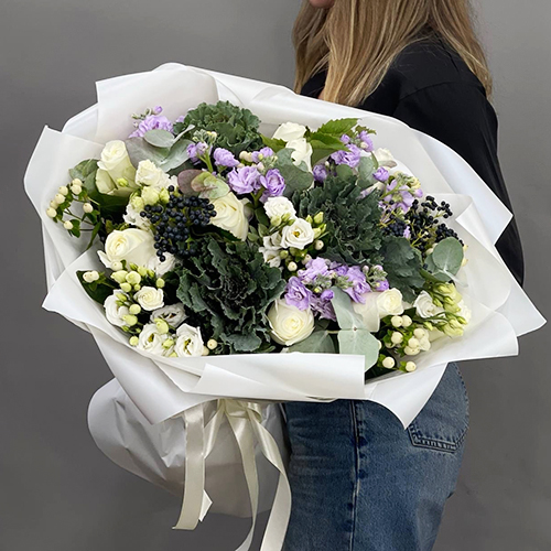 Букет "Ночное рандеву" из брассики, ягод вибирнума, роз, эустом, ароматных маттиол и гиперикума