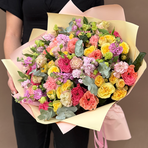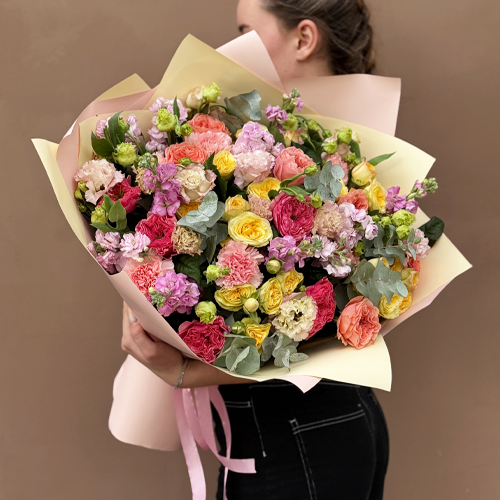 Букет "Яркая птичка" из пионовидных роз Риджертс Парк, маттиол, диантусов и эустом