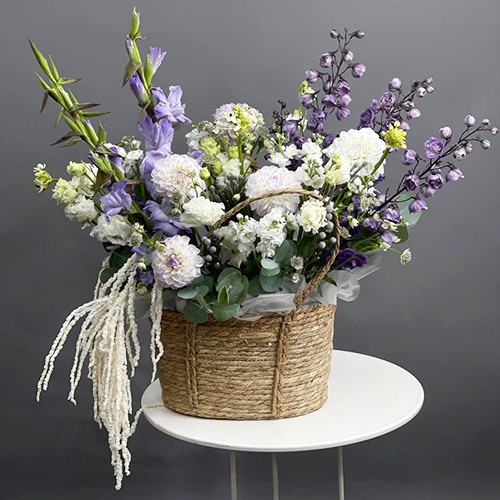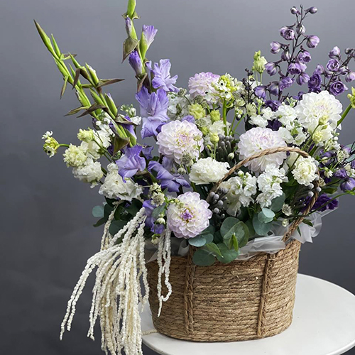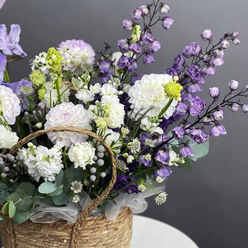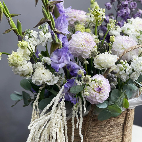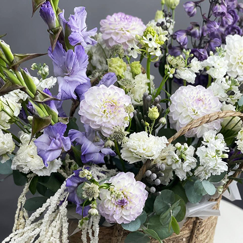 Композиция в сумке "Вдохновение" из дельфиниума, георгин, маттиол, гладиолусов и эустом