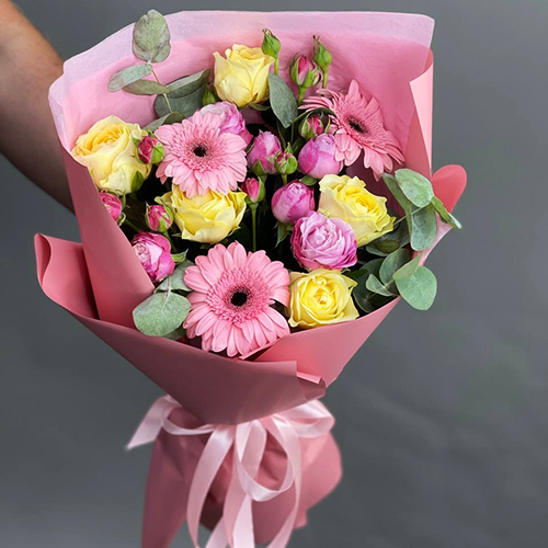 Букет "Беверли-Хиллз" из гербер, роз Баттеркап и эвкалипта