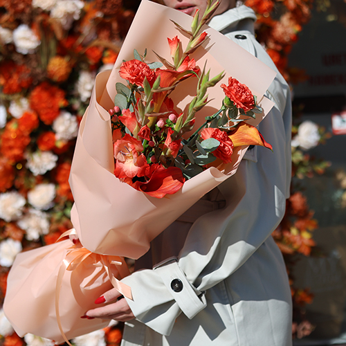 Букет "На закате дня" из гладиолусов, калл, гиперикума и диантусов