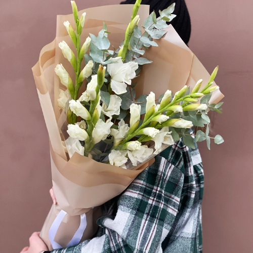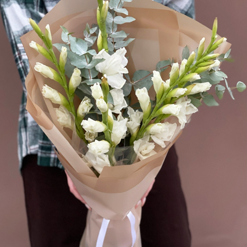 Букет из 5 белых гладиолусов и эвкалипта