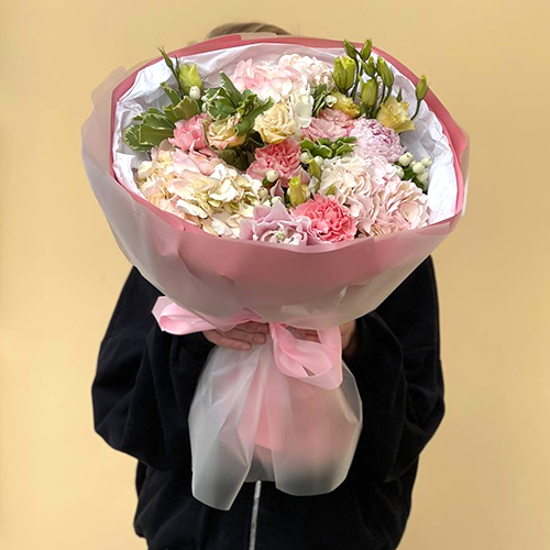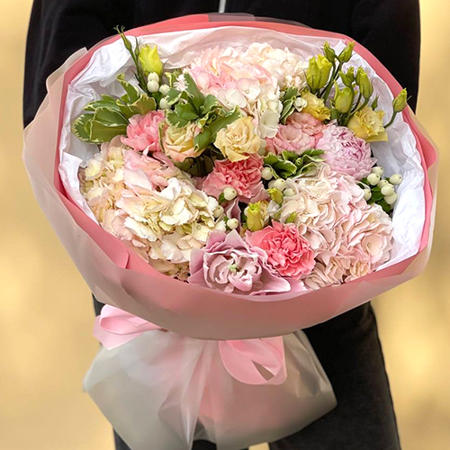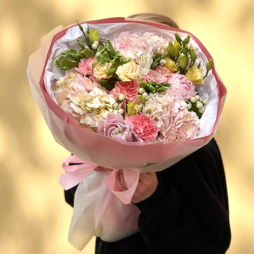 Букет "Никки" из гортензий, гиперикума, питаспорума, пионовидной лилии, эустом и диантусов