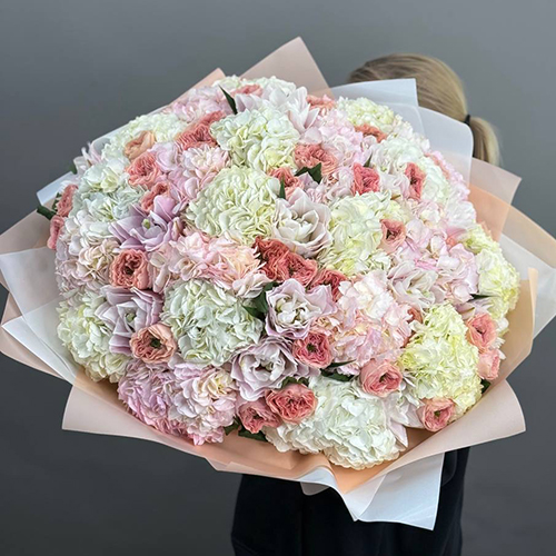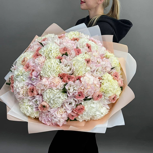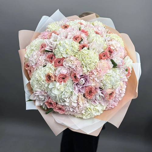 Букет "Ля мур" из гортензий, пионовидных роз и пионовидных ароматных лилий