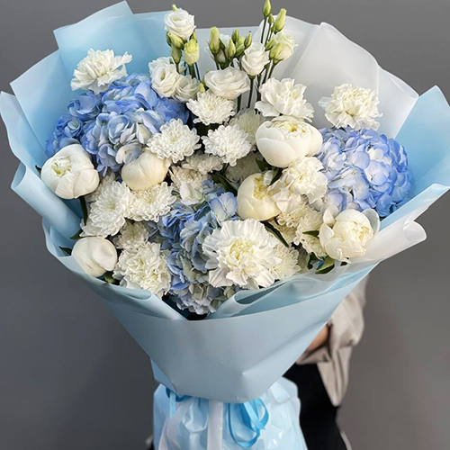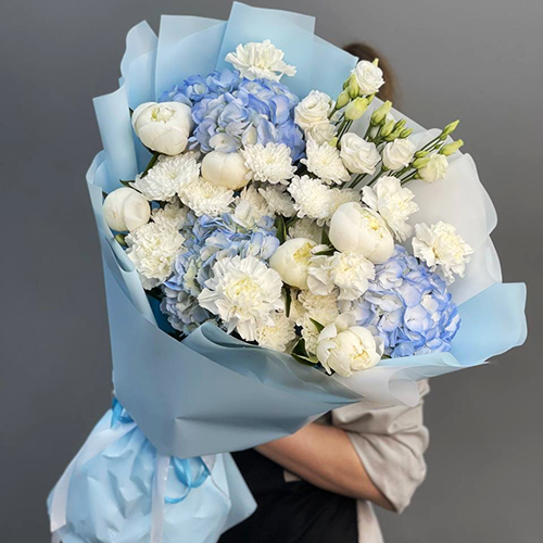 Букет "Глазурь" из гортензий, пионов, диантусов, хризантем и эустом