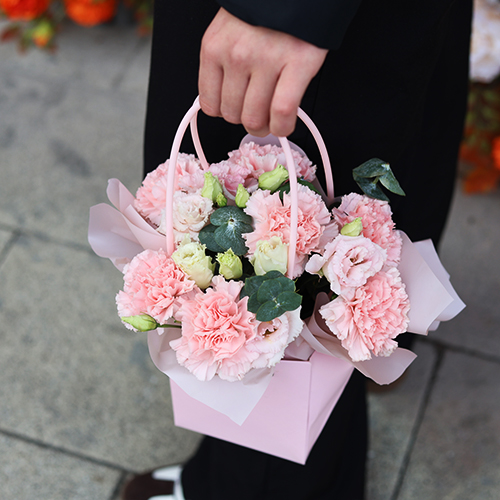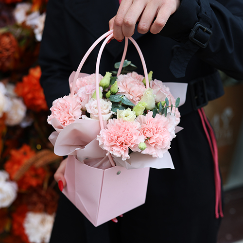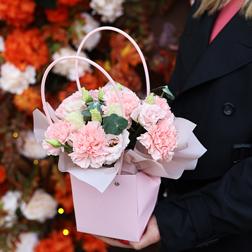 Стильная композиция в сумочке из диантусов, эвкалипта и эустом