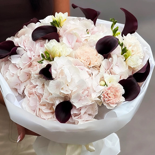 Букет "Пенелопа" из калл, гортензий, ароматных фрезий и диантусов