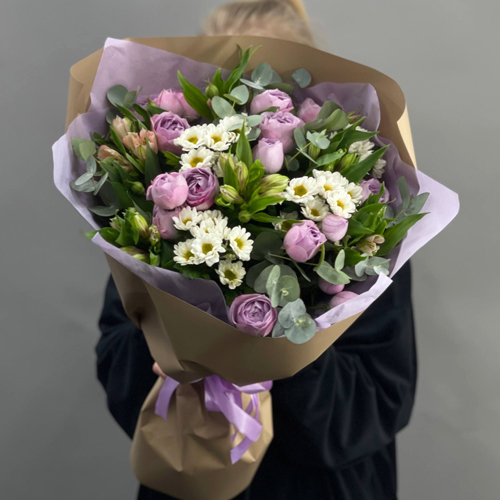 Букет "Парадайз" из кустовых пионовидных роз, альстромерий и хризантем сантини