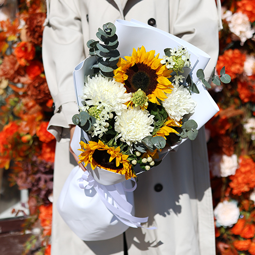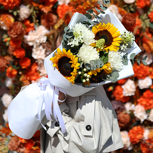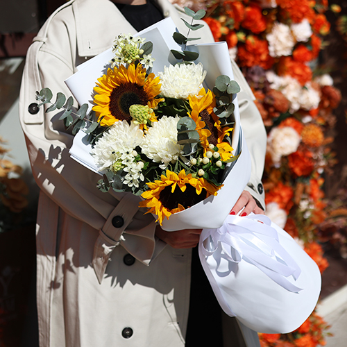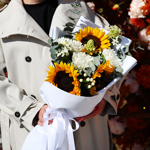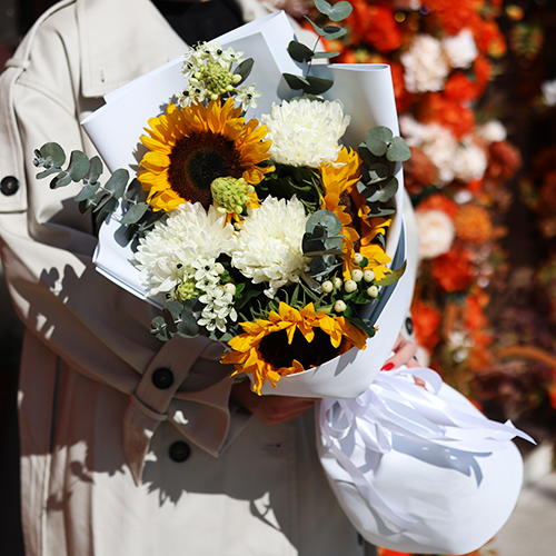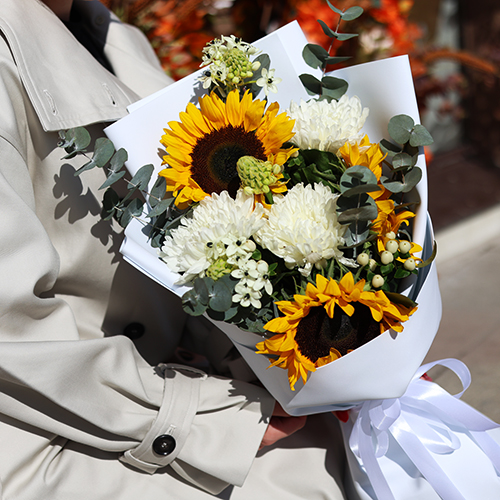 Букет "Солнечный цветочек" из подсолнуха, гиперикума, хризантем и орнитагалума