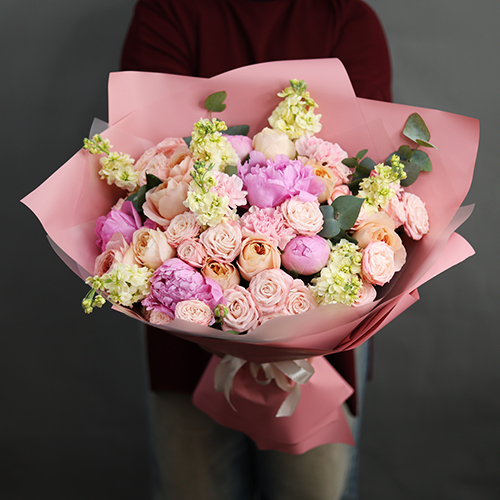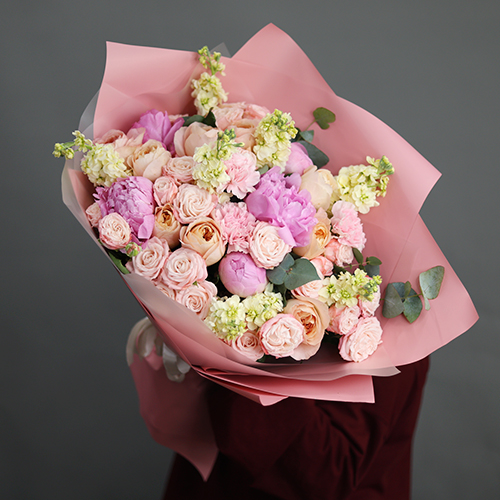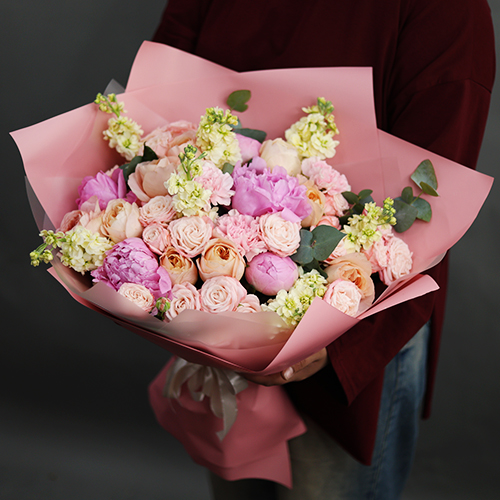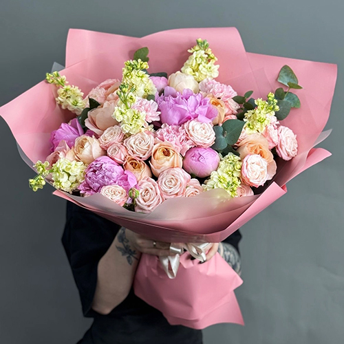 Букет "Элегия" из пионовидных роз, пионов Пилов Толк, ароматных маттиол и диантусов