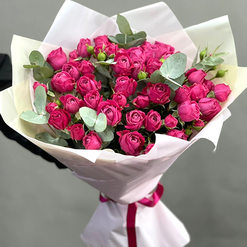 Букет "Малиновый бисквит" из кустовых и пионовидных роз и эвкалипта