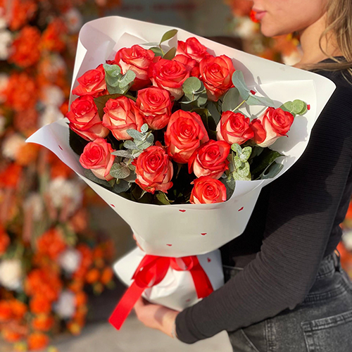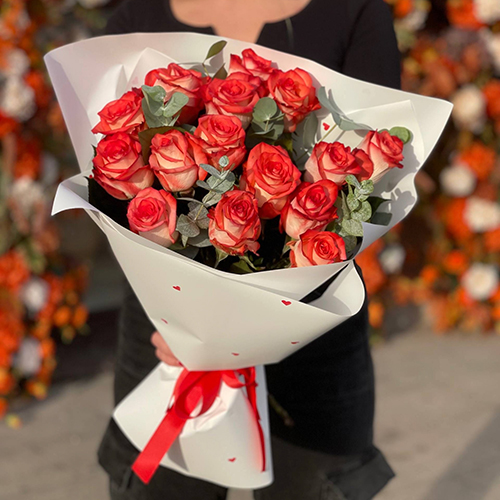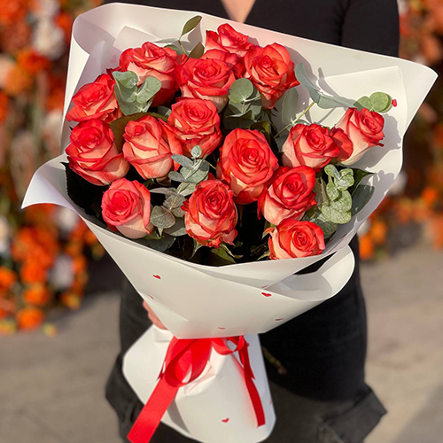 Букет из 15 красно-белых роз Кения с эвкалиптом (40 см)