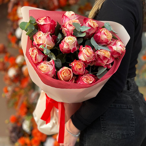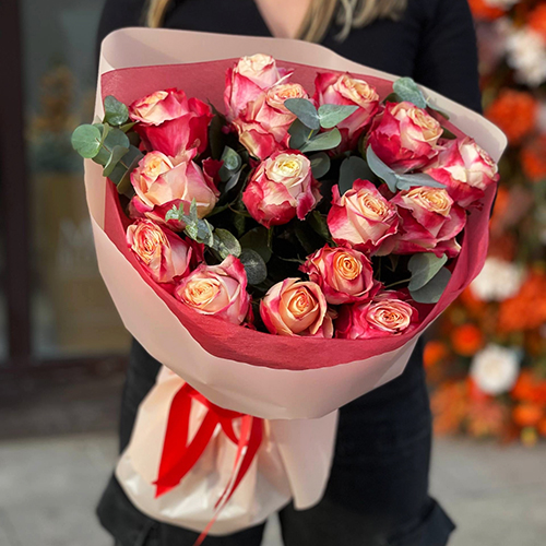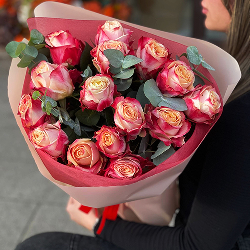 Букет из 15 роз Кения с эвкалиптом (40 см)