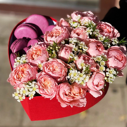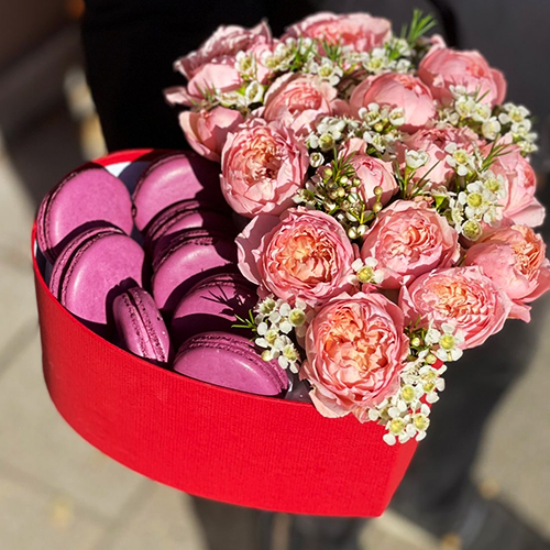 Подарочная композиция с макарунами и пионовидными розами Джульетта (макаруни по наличию)