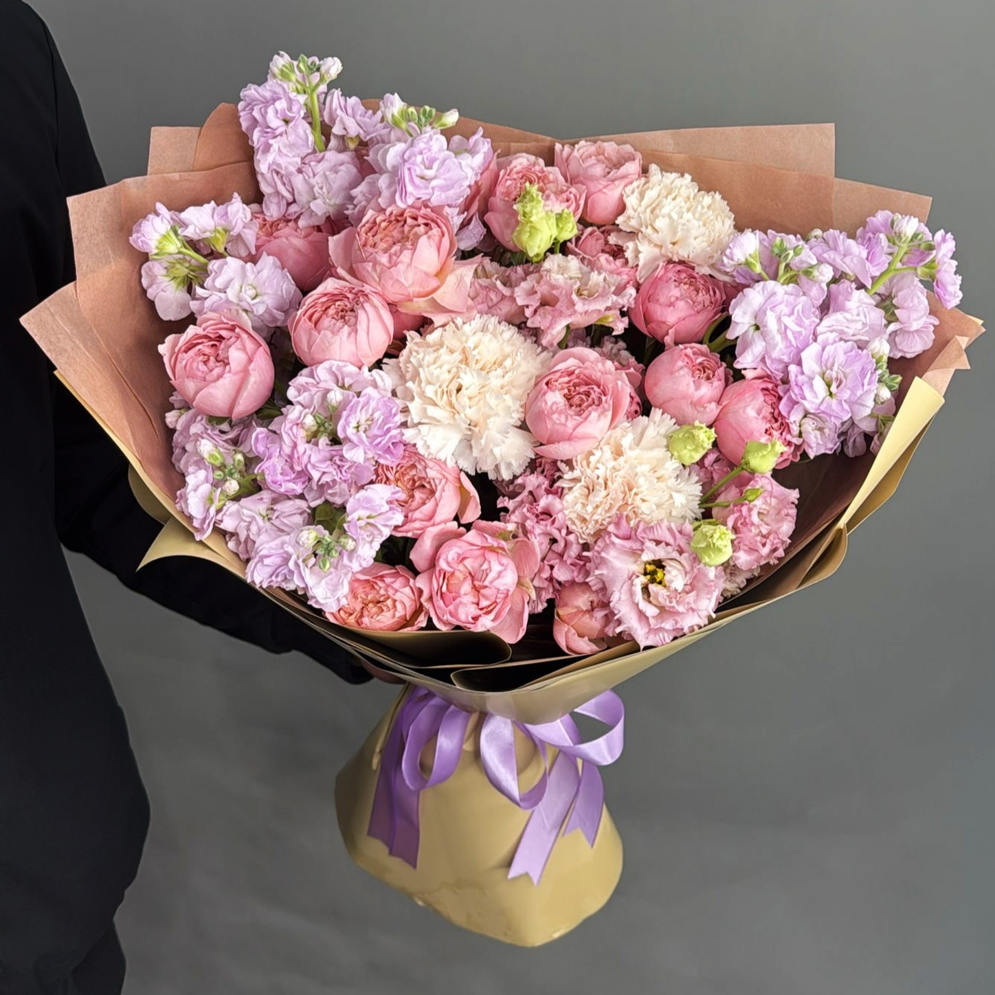 Букет "Амели" из ароматных маттиол, пионовидных кустовых роз Джульетта эустом и диантусов
