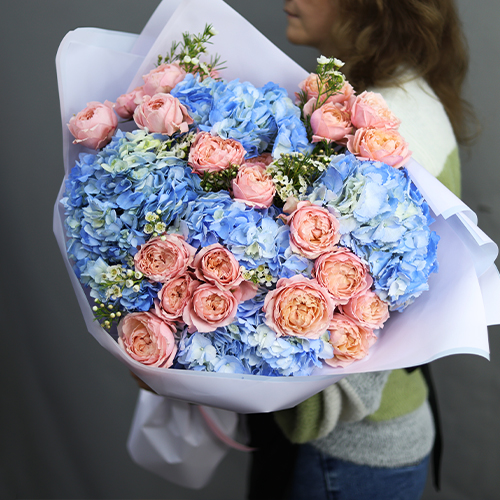 Букет "Тону в твоих глазах" из кустовых пионовидных роз Джульетта, хамелациума и гортензий