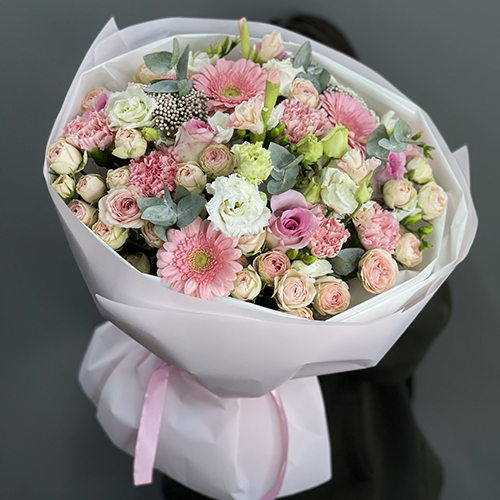 Букет "Я с тобой" из роз, эвкалипта, гербер, ароматных фрезий, озатамнуса, эустом и диантусов