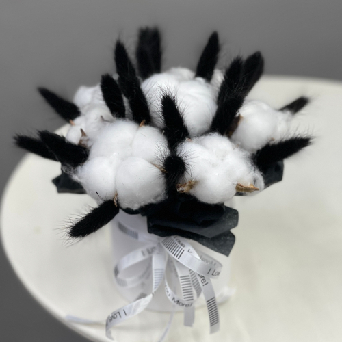 Композиция в шляпной коробке мини "Чикатуха" из хлопка и лагуруса