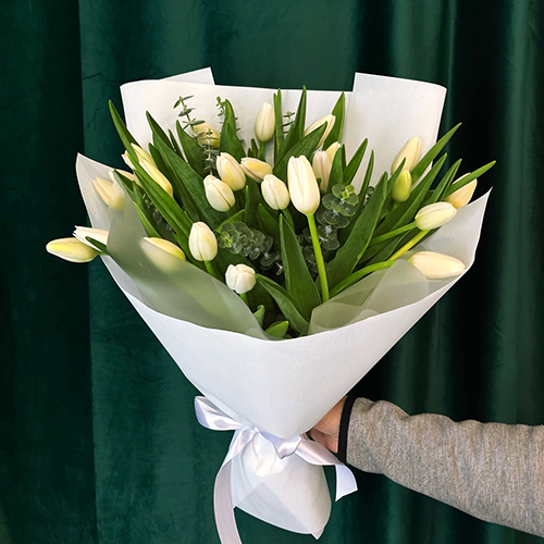 Букет белых тюльпанов с эвкалиптом